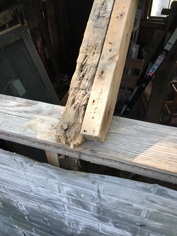 The old sill plate was rotten. Someone had tried to fix this by tacking a short piece of 2 X 4 to the bottom of the plate; between two of the studs. It was obvious to me that this whole plate would have to be replaced.