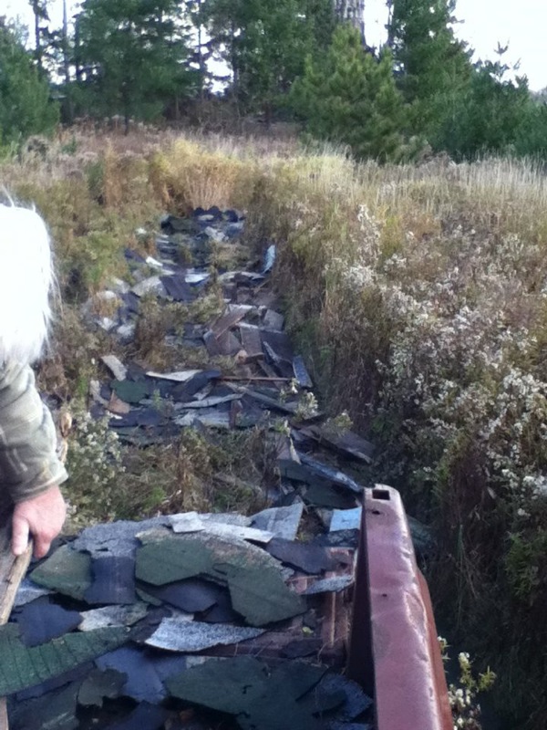 Some of the shingles were spread out in a row over weeds and grass in an area of the new plantation where I have not been able to get tree seedlings established due to the rich soil and thick, persistent, grass that quickly overcomes herbicides, mowing, and plowed furrows as methods of release.