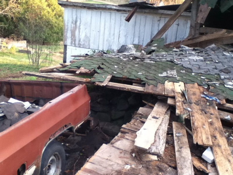 Once I had cleaned up as much of the roof that was down I connected chains to the remaining roof section and gave it a pull.