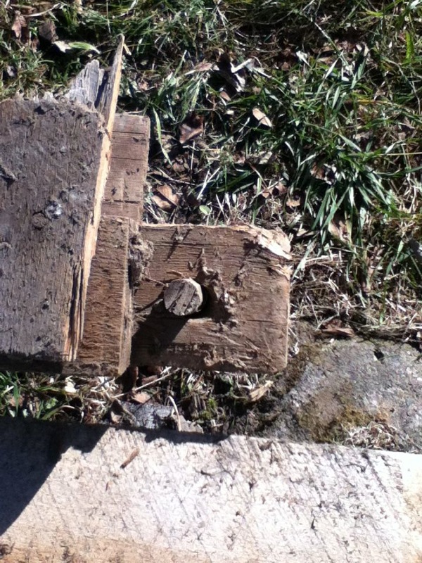 As you see, many of the pegged tenon joints are still intact. This was one of the main reasons the barn was so stubborn about coming down. I would be willing to bet it is one of the reasons the main part of the barn stood up to the tornado in 1952 that removed the roof and siding from one side.