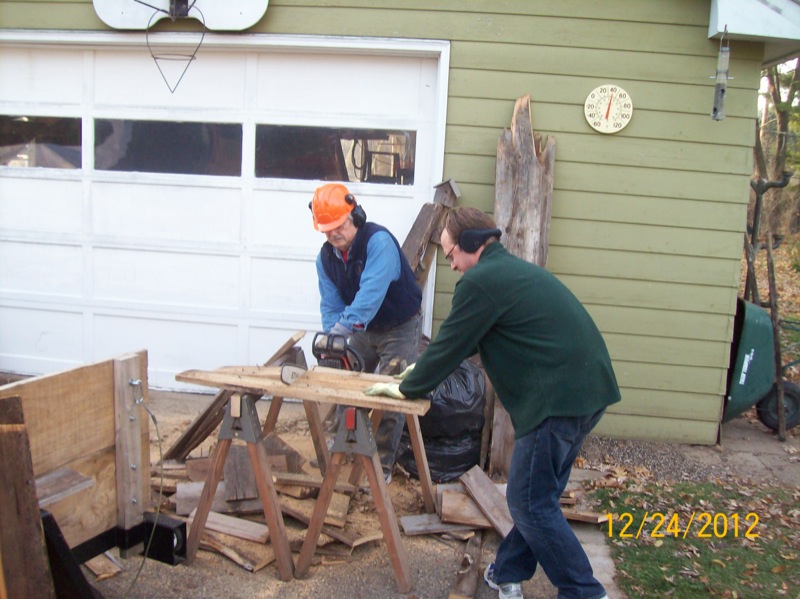 The boards had to be cut into stove size pieces and this seemed to be the most efficient way to do it. We just had to be careful not to hit any nails.