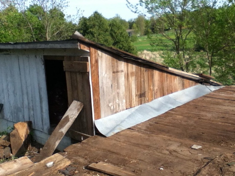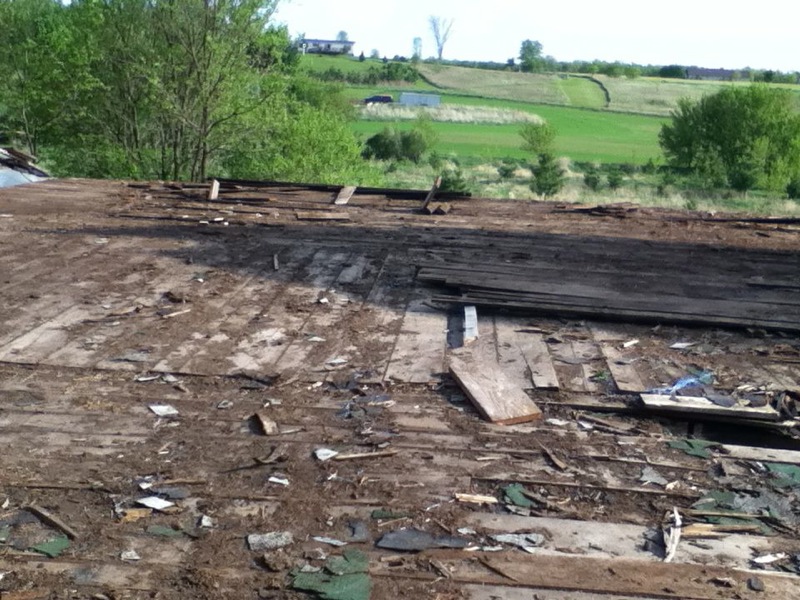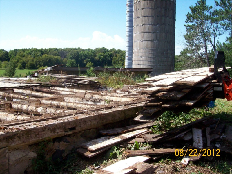 I was very careful, during all phases of this take-down, to spare the milk house. Since it was added on to the barn it used the barn wall for one of it's attic wall (shown here). When the wall pulled away this left a gaping hole that had to be covered to keep the rain out of the insulation, etc..