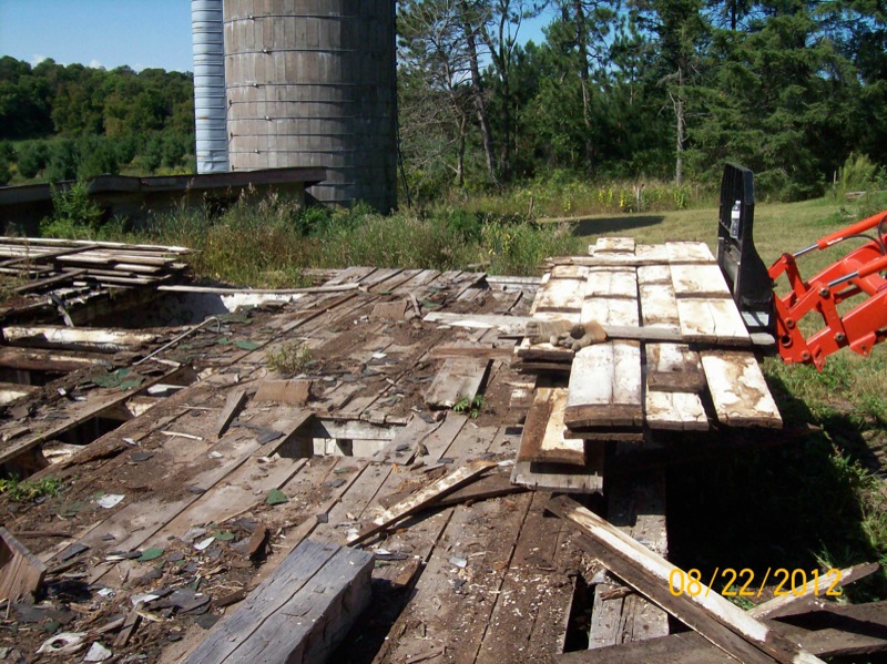 All the siding and beams are removed and packed away. All the trash (old hay and other crap left behind in the old hay mow) has been cleared off the deck. Leaving the bare floor - still coated with a layer of dirt - ready to be pulled up board by board.