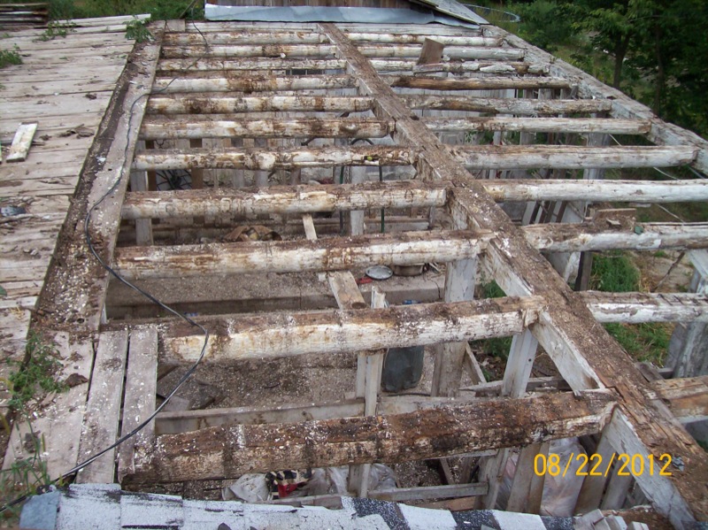 I continued peeling the floor boards off of the south end which explsed the underlying support beams and rafters. Everything looks pretty rough but this is mostly due to the staining from rainwater infiltrating through the cracks in the floor boards (which had a century worth of hay dust and other dirt trapped between the layers.