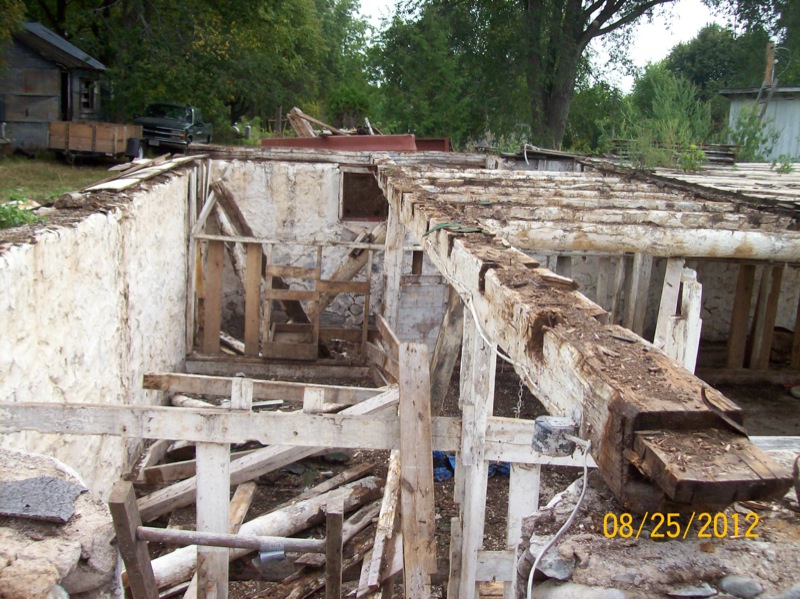 Once all the cross beams were remove in the first course, it was a simple matter to connect a chain to the main beam and pull it to the side thus dropping the next course of cross beams into the basement. I then pulled the main beam out 'through' the window notch in the foundation (shown at bottom of this picture).