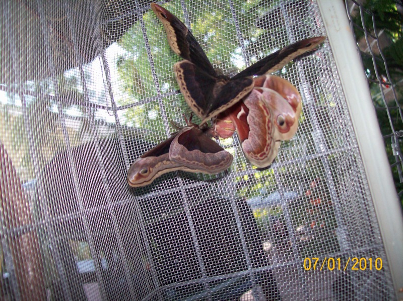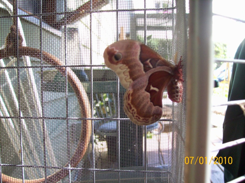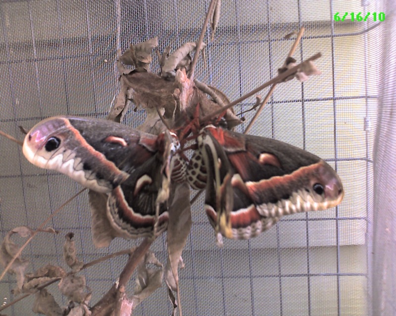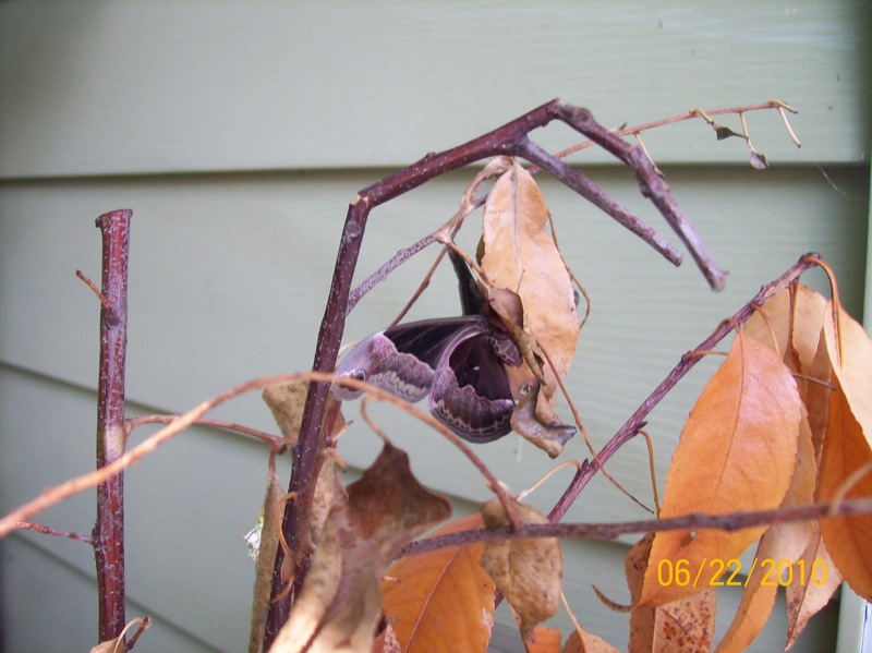This female waited till July 1, 2010 to emerge from her cocoon. I was afraid she would be too late to attract any males from the environment.But within 4 hours (at around 5:00 PM) we had 3 males flitting around the cage. This is an amazing feeling for those of you who have never seen it. It's magical. It's simply amazing. I have seen it a hand full of times since I've been raising these moths and I never get over it.
