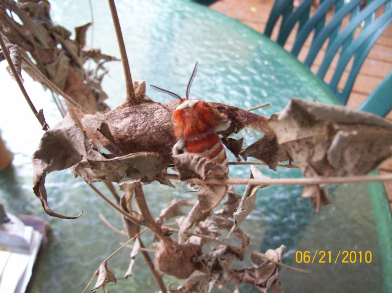 I did have Rupert outside. After checking out another web site it appears Rupert was really Ruby. She had very short and fine antennae so I am assuming she was a "she" - plus she had a really big abdomen. I put Ruby outside right after I got your last email. We had a very warm spring. I got impatient (and overly curious) and opened up the outer cocoon. I wanted to make sure she was still alive. I had her laying somewhat exposed (but highly protected) for about two weeks. I kept her in an aquarium with a flour sack dishtowel over the top on a protected section of my deck. I hope she didn't hatch too early! The good thing is that the caterpillars live in my town home area naturally. I usually find one or two each summer. It was a very rainy weekend so that might have kept the males away. I think Ruby took off in search of a male.