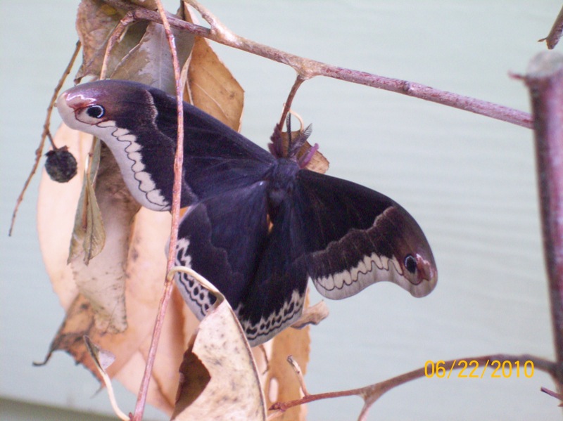 - July 1: WAIT A MINUTE !! This morning Debi discovered a Prometheus moth in the cage (on the deck) and it's a Female -newly emerged. At 5:15 this afternoon three males came to visit. More