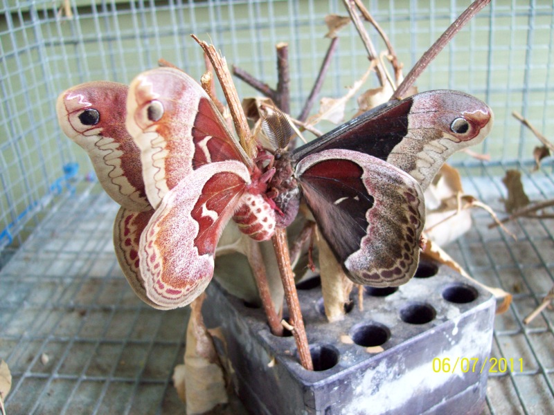 This male has just flown in from the wild (attracted by the female's pheromones) and they imediately began coupling. This will continue for a few hours after which the female will imediately fly away to find an appropriate tree upon which to deposit her eggs (if I let her).