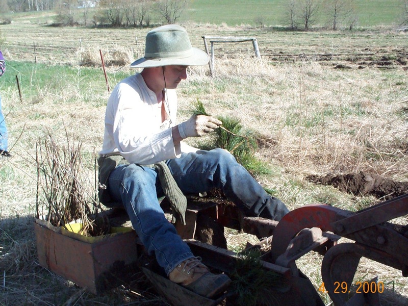 As you see, there is only one person planting - with this planter. He has two trays and we have hardwoods in one and pine in the other. We don't fill the trays full for fear of having the seedlings exposed to the drying effects of sun and wind before we get them in the ground.