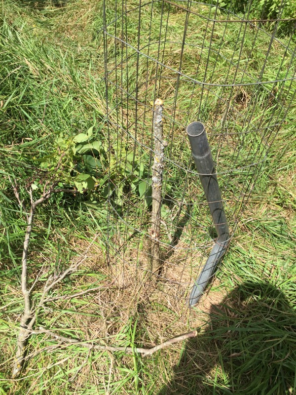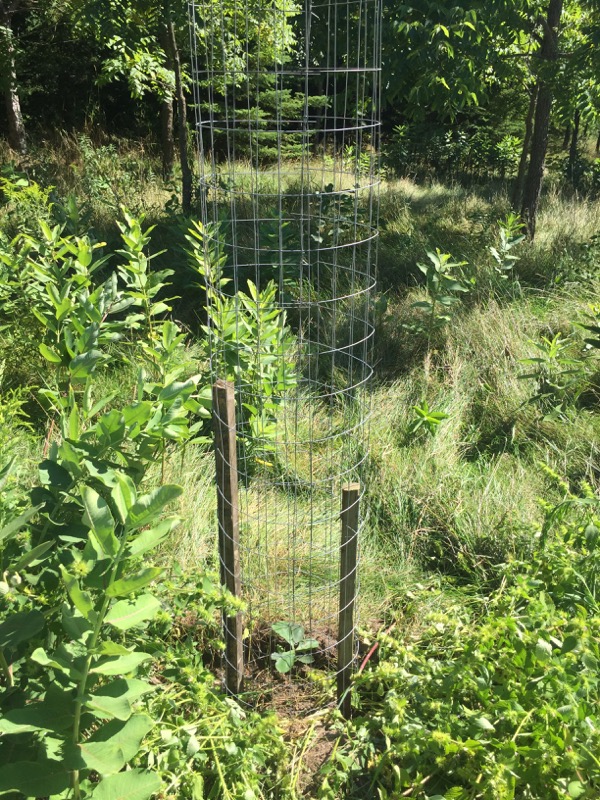 I have installed a cage to prevent further deer browse. ( You can see that I use anything I can find for a post.)