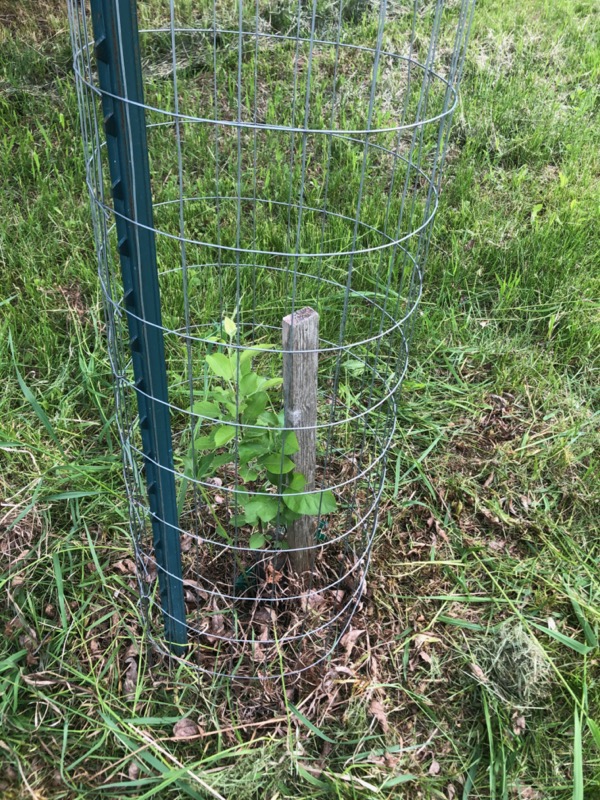 Of course, I must fence in each Oak that I put out. This not only protects from browse it also marks the tree. I am not fencing the apple even though I know that deer like to eat apple. I just don't have enough cages.