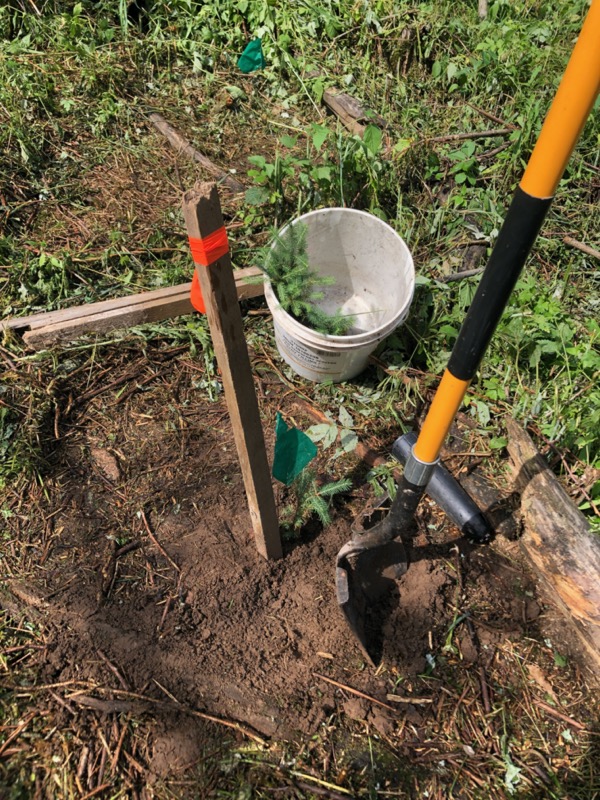 Marker Meanings: Green Flag; Spring 2021 transplant, Wooden Stake; re-plant from 'rescue spruce' in summer 2021