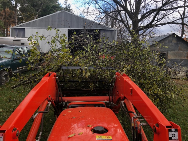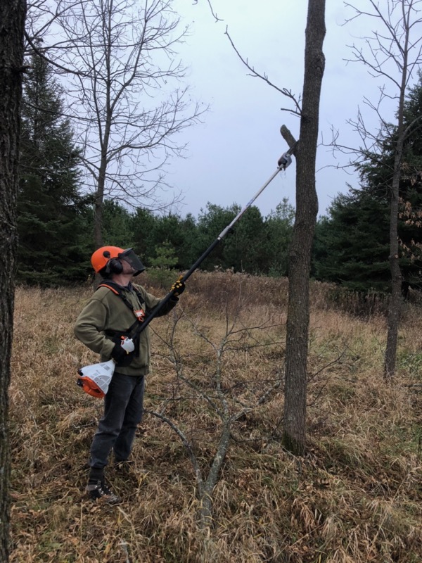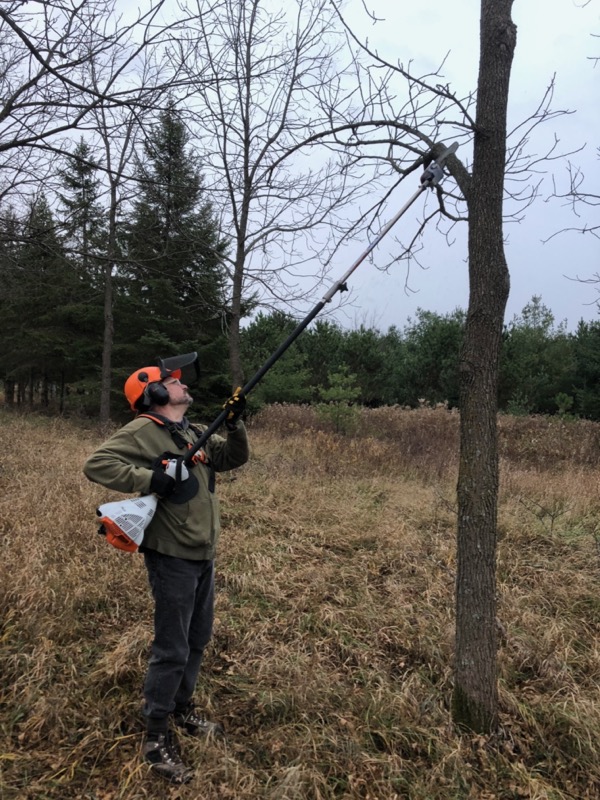 This is the third pass at pruning up the walnut trees. The first pass I was on foot with a chainsaw and pruning up as high as I could reach. The second pass I would stand on the fenders of the tractor and prune as high as I could reach. This fall I bought a power pole prunner and began the third pass as high as that will reach.