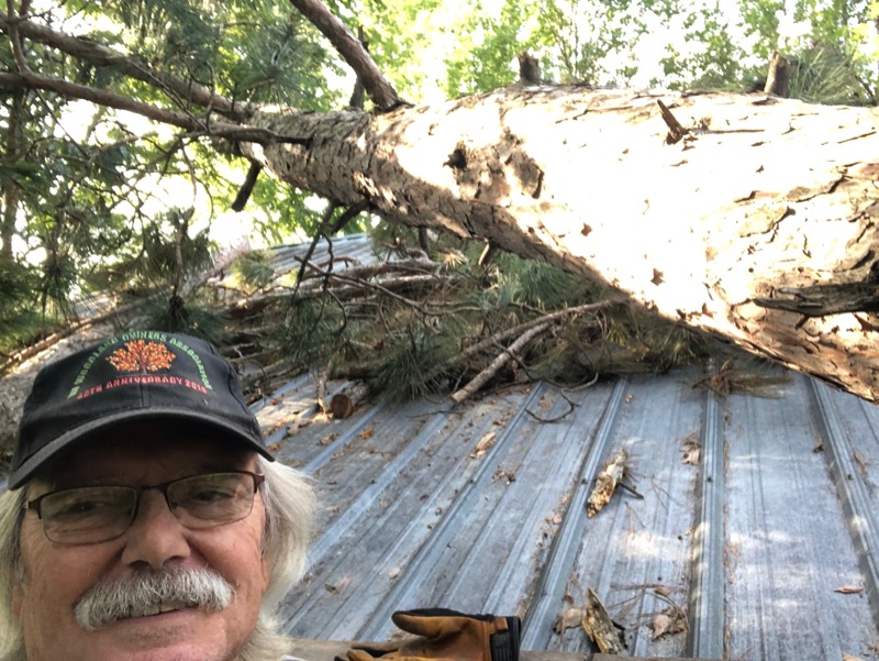Red Pine blew over in wind storm and GENTLY settled on Tin Shed Roof.