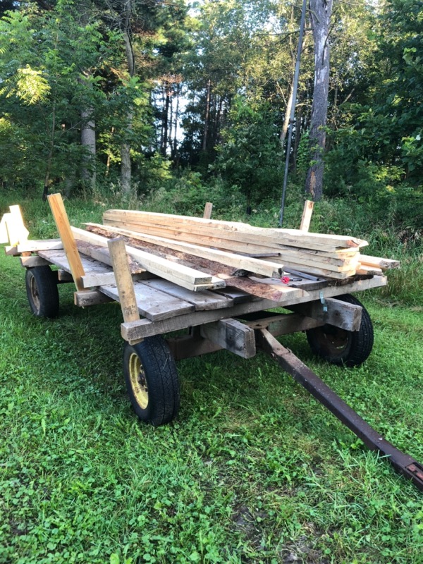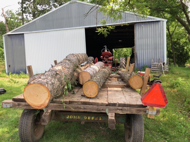 This Red Pine is an 'old growth' tree. It was planted in the 1940's by my father and it has been part of the windbreak for over 60 years. The wood is too good to let it rot on the ground so I pulled it out and loaded it on the wagon with a couple other logs.
