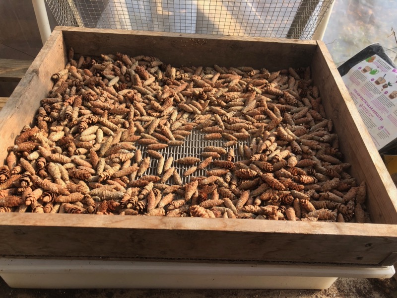 I kept them in this screen box over winter in my greenhouse. The intermittant hot and cold caused the cones to open and drop their seeds.