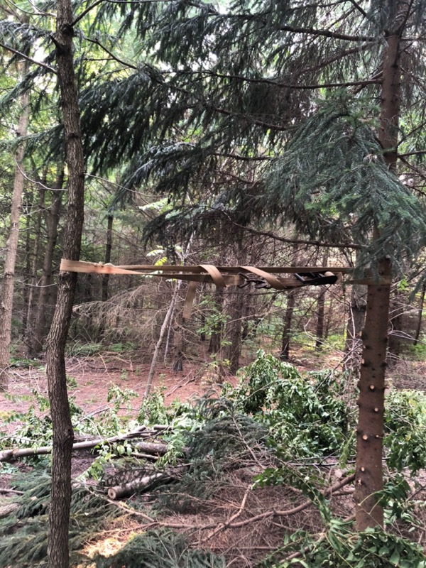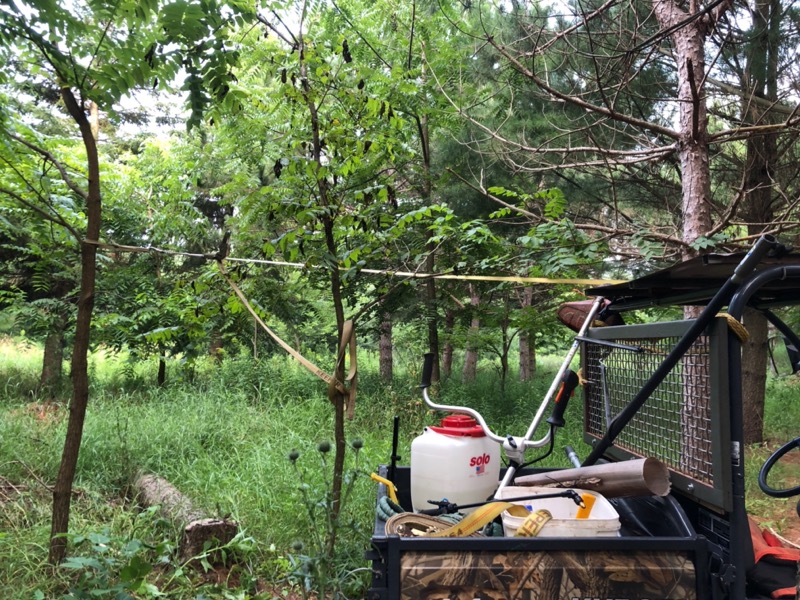 In some cases the competing pine caused an otherwise straight young walnut to lean away. I am attempting bring these upright so they can take godd advantage of their new space on the ground and access to the sky in the cleared canopy.