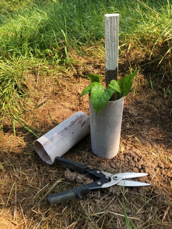 I cut up old tree tubes to make short collars to go around the base. I'm hoping this will discourage rabbits and other creatures from attacking the stems.