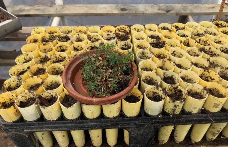 August 2025: Seedlings in Cone-Tainers after first summer's growth.