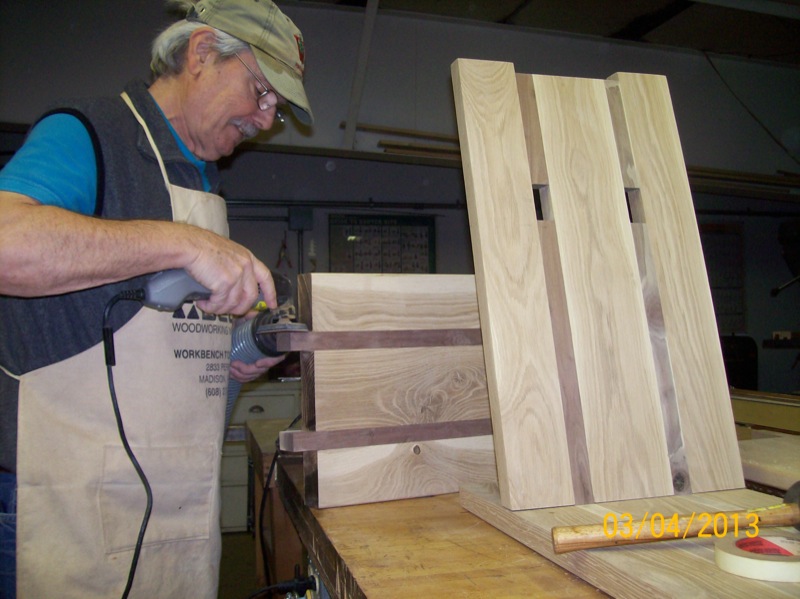 The final step was to cut slots in the shelf tenons to accept the wedges that hold the thing together.