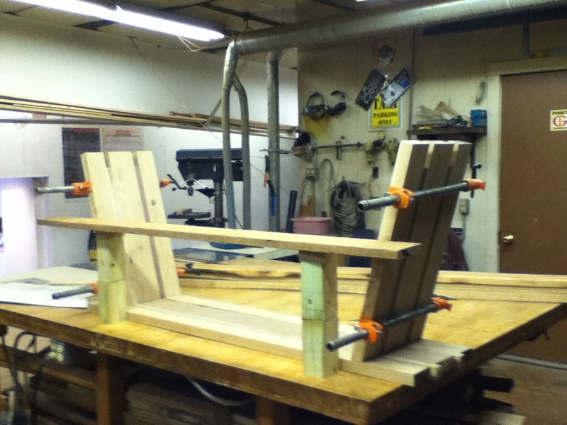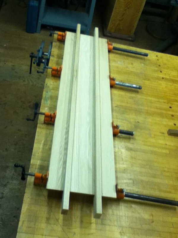 What you see here are the end piece CLAMPED together and positioned within the top piece (already glued) in order to determine both the position and length of the shelf. I did this by sight in order to choose the position of the shelf that looked best to me.