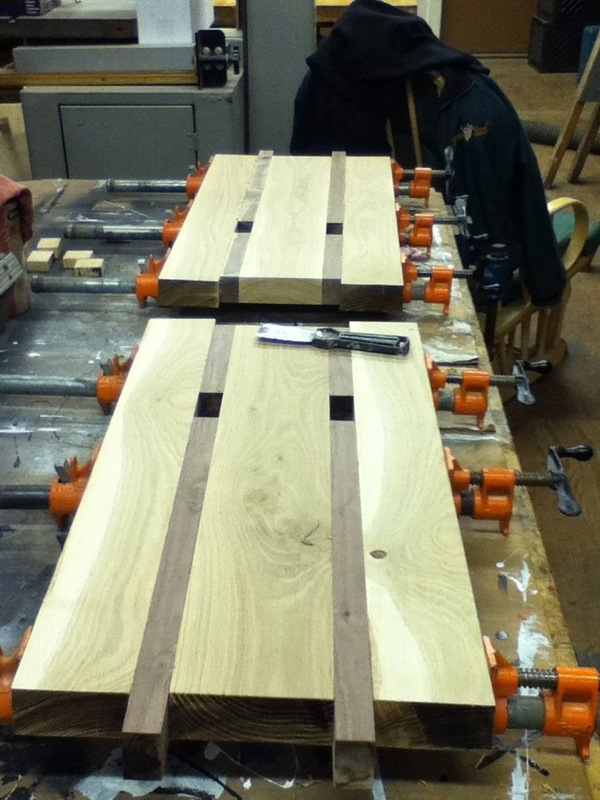 Now that the shelf is complete, it's time to place the side tenons and then glue up the pieces. This is probably the most critical part of the whole assembly process. At this point I haven't made the cuts in the walnut strips.