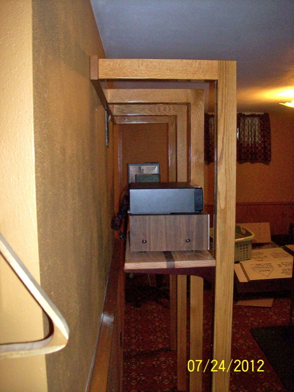 This new one is made from oak and walnut. The original was made from some cheap pine 2 X 4's with particle board shelves. I stained everything dark walnut - which hid some of the butchering I did in making it (I'd like to think I have improved and I know that I now have better tools - I cut the miters for the original on a home-made miter box.)