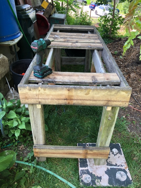 I also scrounged some 4X4 treated posts from the curb -- a neighbor was replacing an old fence -- which were in good shape above where they had been in the ground. I used 6 of these 4X4's and a few of the deck boards to make this stand.